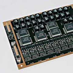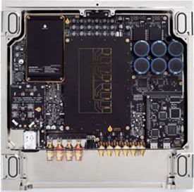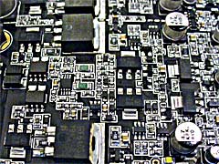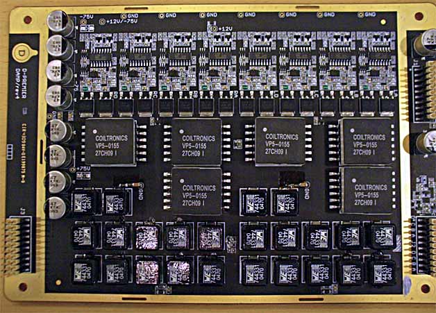 その流れの末端に位置するパワートランジスターを拡大したのがこの左の写真。左右で4個あり、プッシュプル動作をさせて更に左側への出力端子へと向かいます。 この間わずか20ミリ程度の最短距離であり、このクラスAアンプの忠実度がD-Premierの心臓部であることは間違いない。 この小さな増幅段ではミリセカンド単位という短時間であれば何と5アンペアを出力できるという見かけによらず強力なのだが、 到底これだけで240Wのパワーは不可能というもの。 実は、写真を取り損ねてしまったのですが、T.I.のPCM 1792のチップの右側のブロックには不思議なことにA/D変換するステージが用意されているのです。 何でまた、せっかくD/A変換したものをデジタル信号に戻すのか? 高精度なクラスAアンプを通過するシグナルパスからのアナログ信号を分岐させ、 それを再度デジタル化するというのはクラスAアンプの支配力を生かしたまま、8個のクラスDアンプにデジタル入力を与えるためだったのです。 そのクラスDアンプというのがこの写真。これはメーカー資料の一部の画像なのですが、この基板が格納されているモジュールのカバーを思い切って取り外してもらいました。 完全に中身が見えるという写真が下の大きな写真です。
