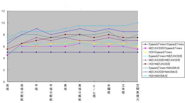 低域/中域/高域:これらは、それぞれの音域の品位、質感、量感等。聴感的に音が良いなーと感じる主要素。
