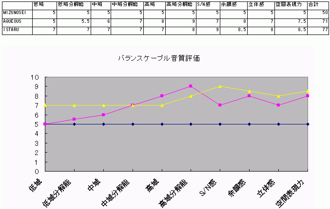 全体の印象を表とグラフにまとめてみました。Mizunoseiを基準5点にしてあります。