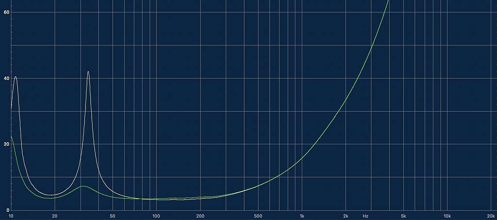 ウーファーユニットのf0に当たる12Hzあたりで約40Ωという上昇が見られるが、注目すべきは