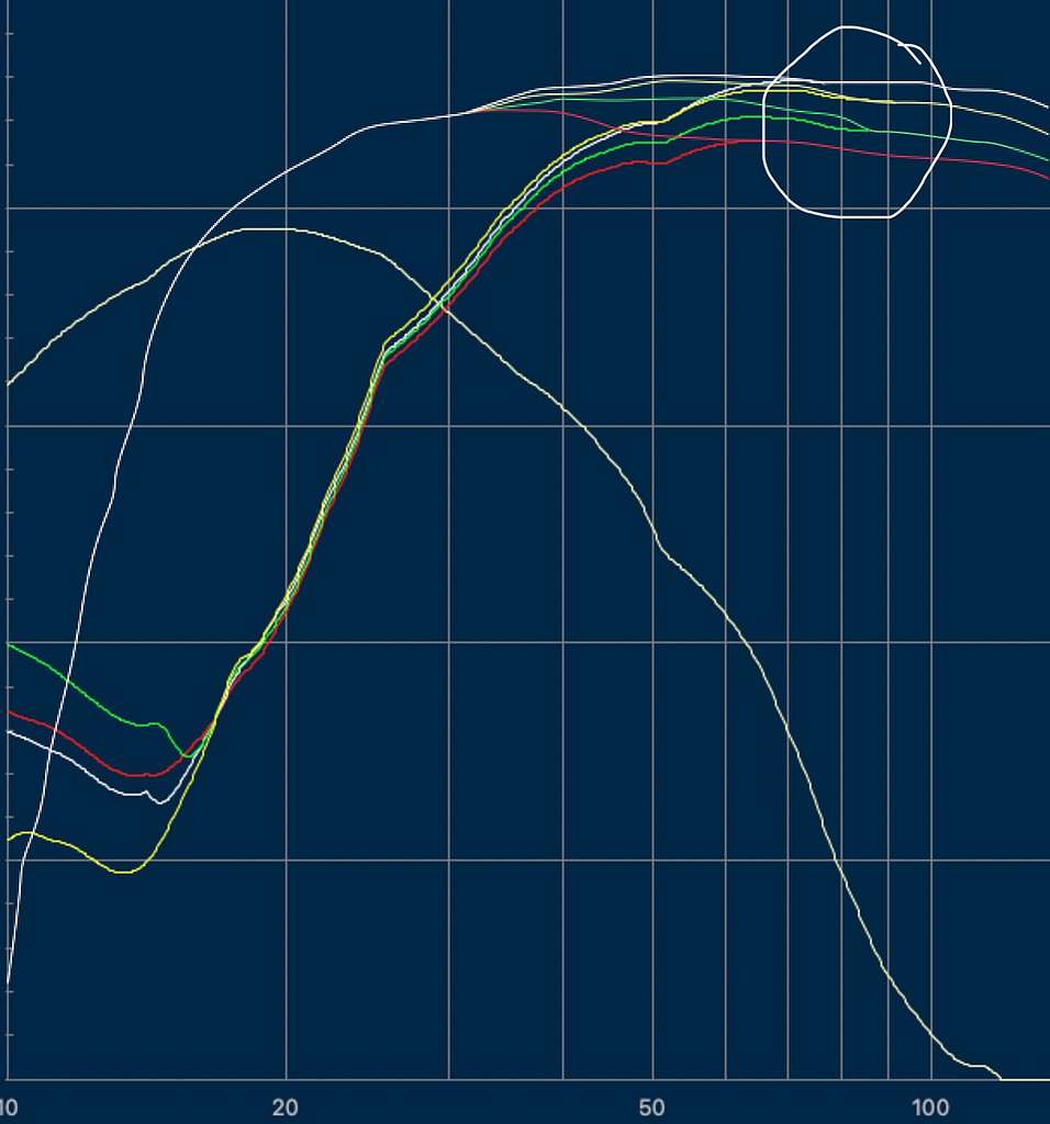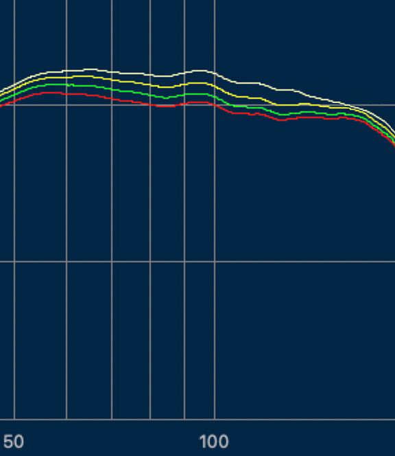 ウーファーだけの特性は4色に分岐している上昇カーブとなっています。